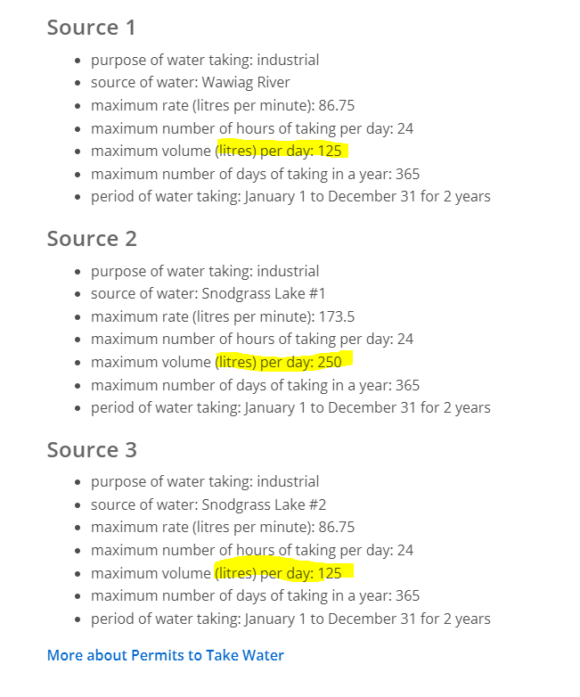 Source 1 is stated to have a maximum volume water taking of 125 litres per day. Source 2 is stated to have a maximum volume water taking of 250 litres per day and Source 3 is stated to have a maximum volume water taking of 125 litres per day, of which doesn't reach the 50,000L/day threshold.