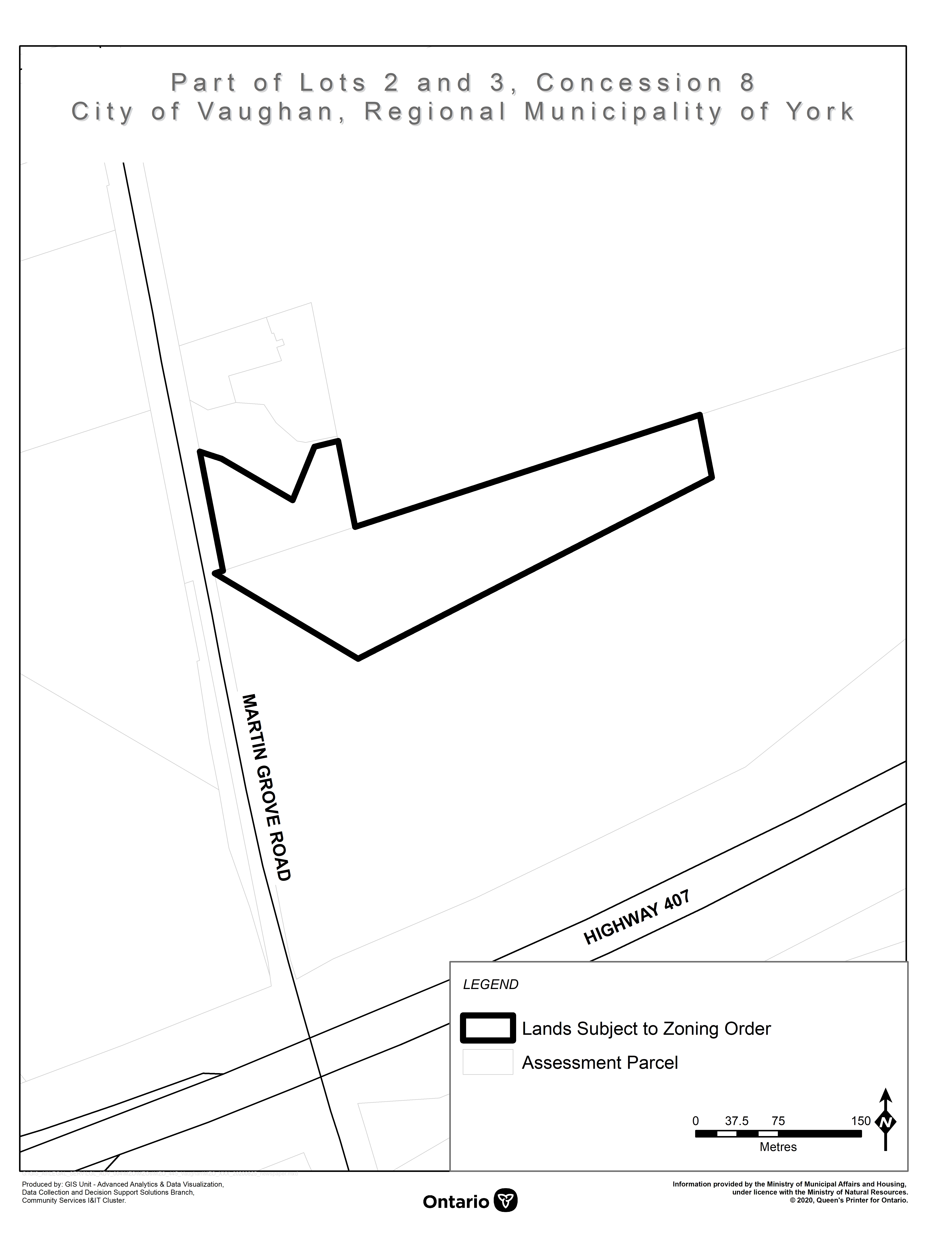 La superficie couverte par le Règl. de l’Ont. 445/20 est d’environ 4,5 hectares de terres et fait partie d’une grande propriété appartenant à la province de l’Ontario, ces terres sont situées dans la ville de Vaughan.