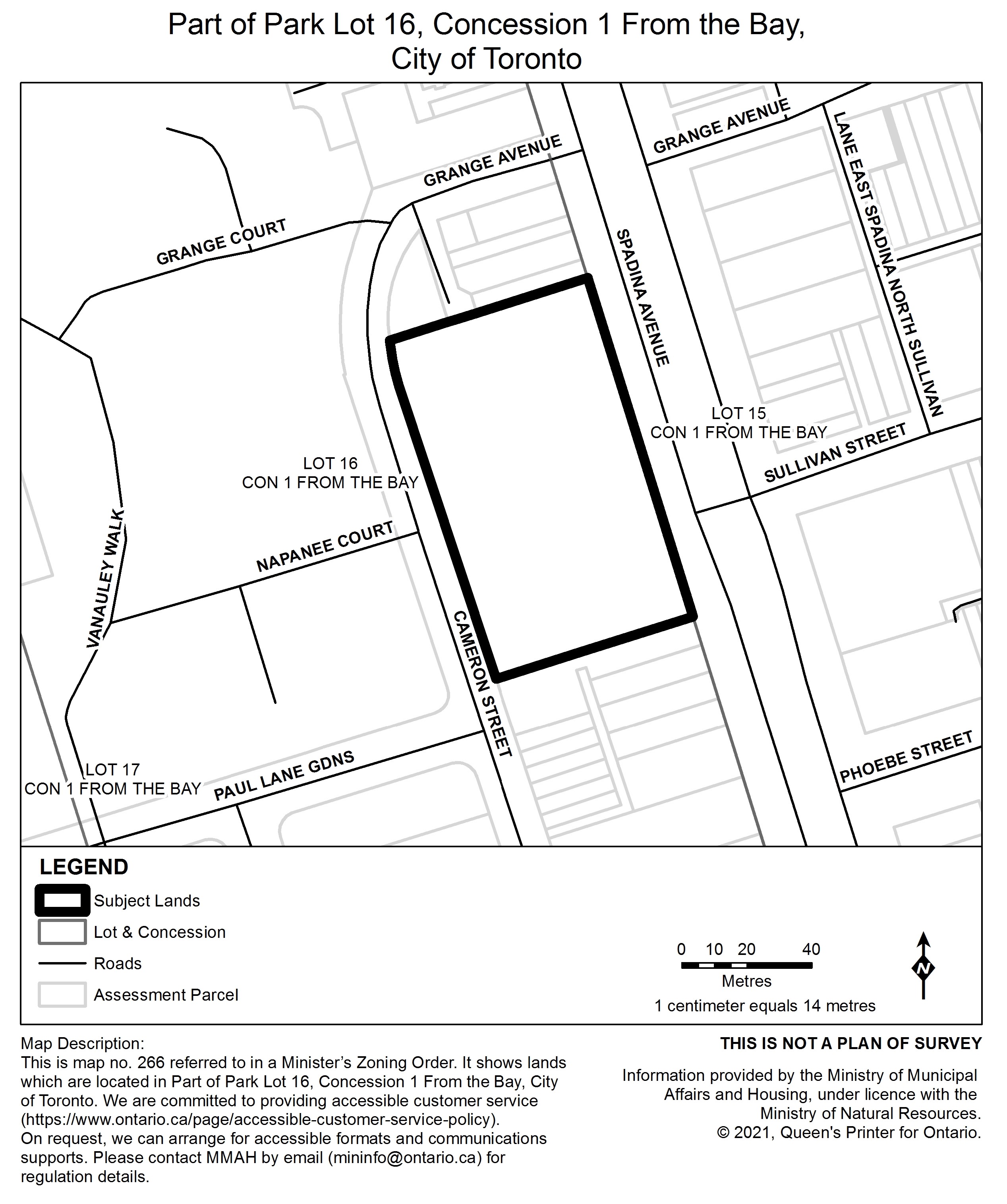 Le Règlement de l’Ontario 545/21 s’applique aux terrains dont la désignation civique est 222, avenue Spadina qui sont situés dans la ville de Toronto. À titre d’exemple, les terrains visés sont représentés sur la carte, dont le lien est fourni ci-dessous.