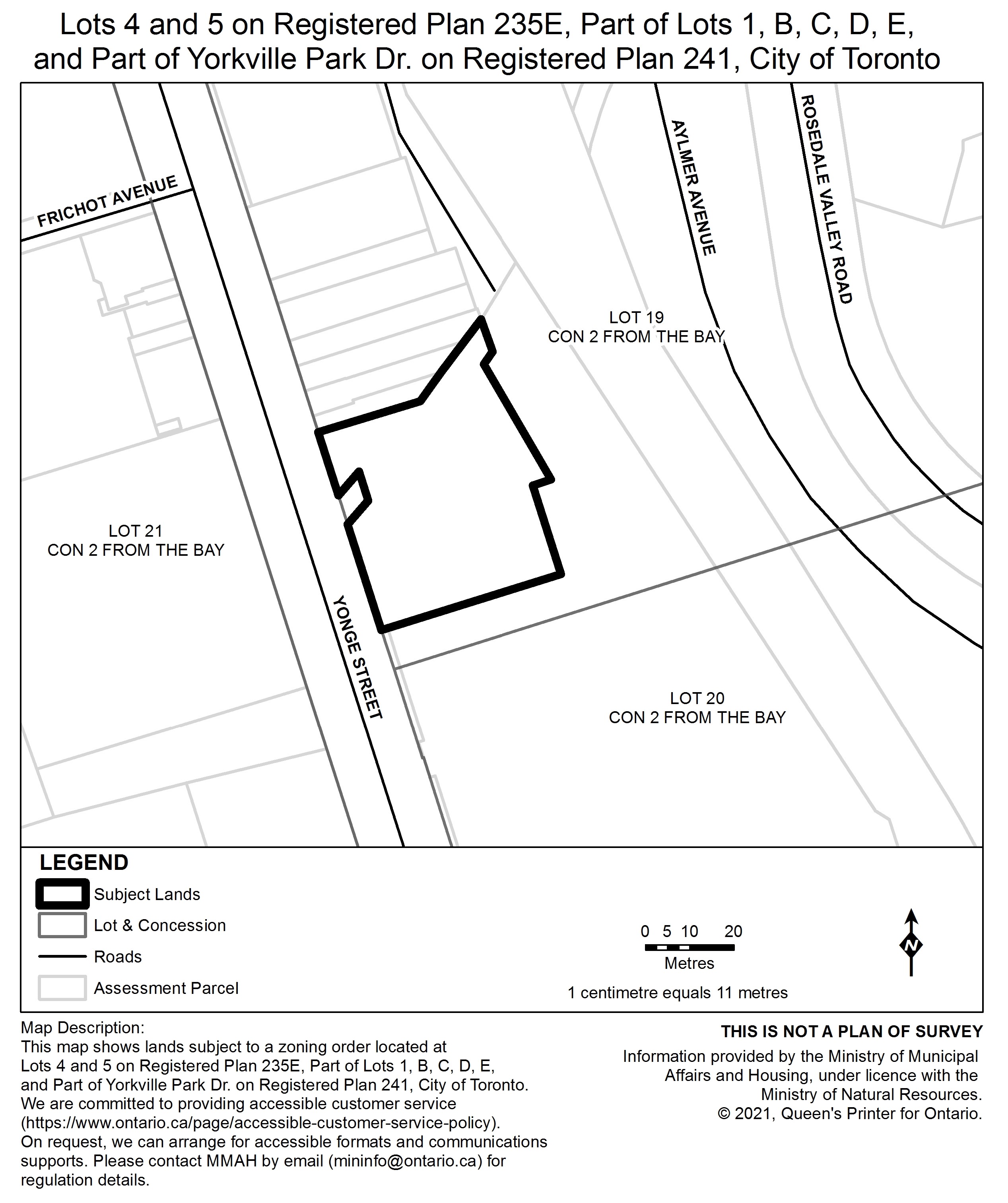 Le Règlement de l’Ontario 546/21 s’applique aux terrains dont la désignation civique est 877, avenue Yonge qui sont situés dans la ville de Toronto. À titre d’exemple, les terrains visés sont représentés sur la carte, dont le lien est fourni ci-dessous.
