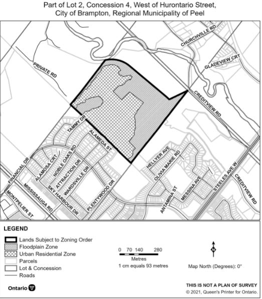 Le Règlement de l’Ontario 784/21 s’applique aux terrains dont la désignation civique est le 8525 Mississauga Road, qui sont situés dans la ville de Brampton. À titre d’exemple, les terrains visés sont représentés sur la carte de référence 282, dont le lien est fourni ci-dessous.