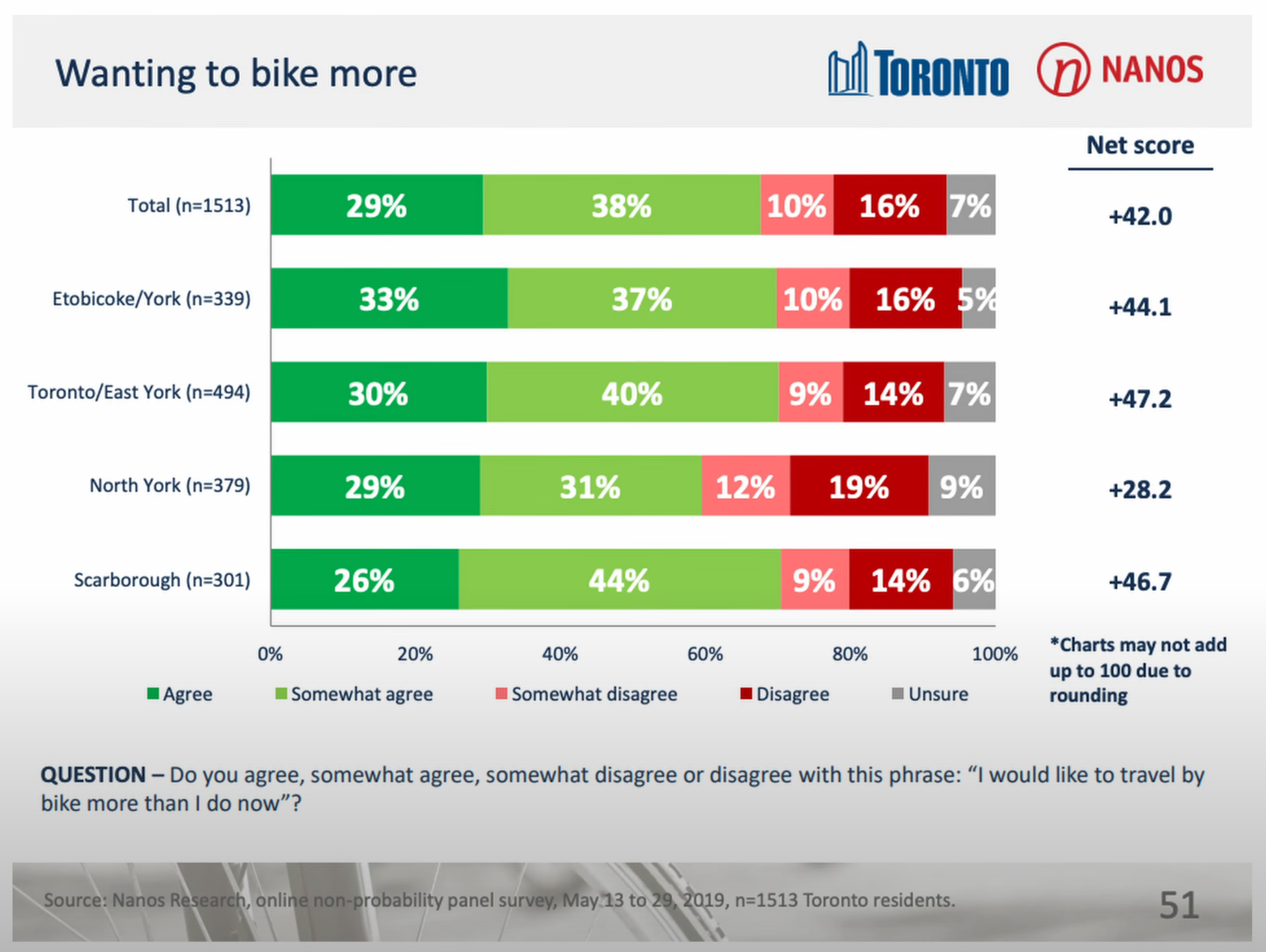 - Inferring that because people don't bike (due to the lack of infrastructure) means that people don't WANT to bike is incorrect. In fact, a study done of Toronto residence shows that there is actually an overwhelming desire to bike more (see attached image).