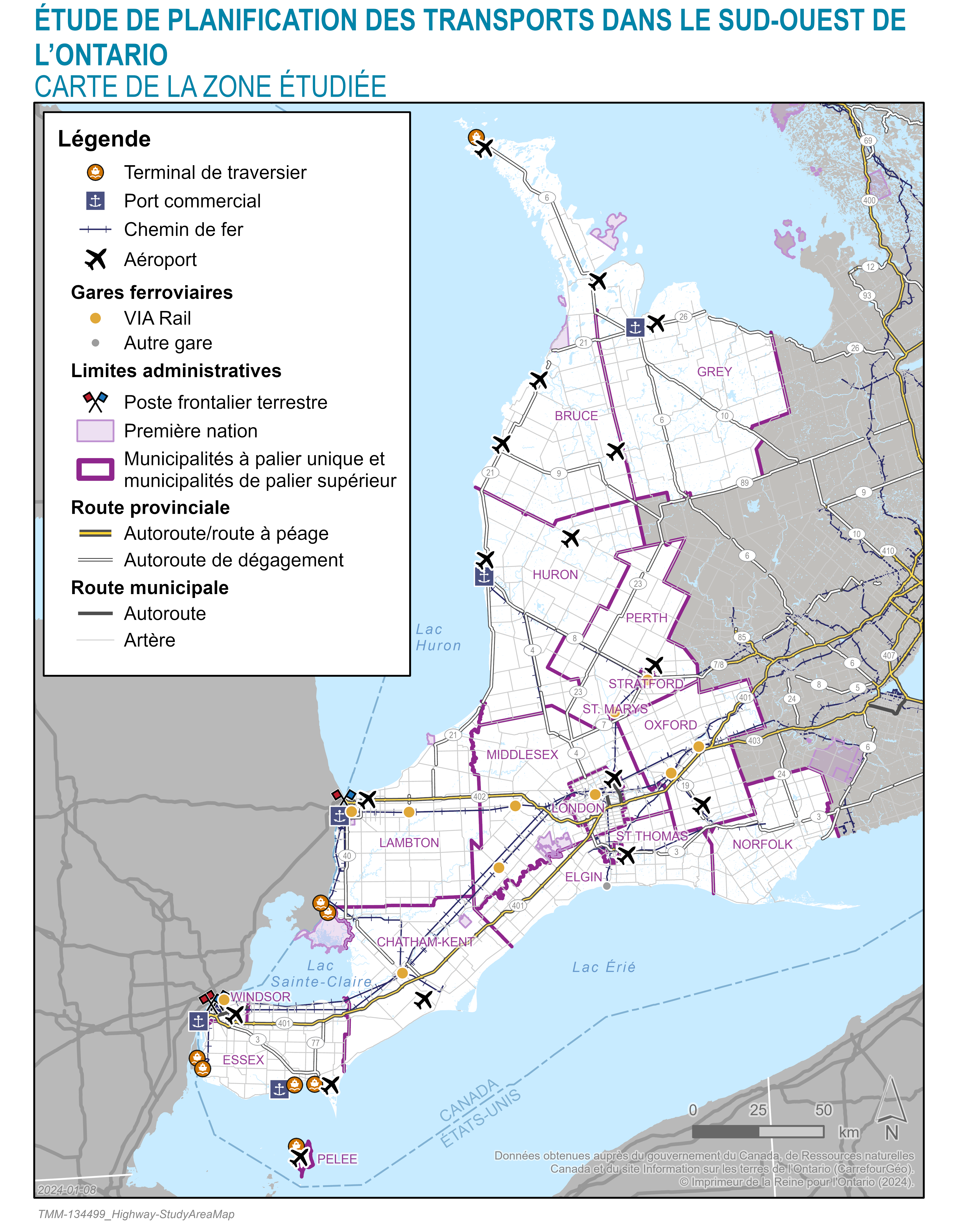 Pour appuyer cette évaluation, MTO entreprend l’étude de planification des transports pour le Sud-Ouest de l’Ontario (l’« étude »), une étude technique multimodale qui examinera la demande, les lacunes et les possibilités actuelles et futures en matière de transport dans le Sud-Ouest de l’Ontario et les connexions avec les États-Unis et le reste de l’Ontario.