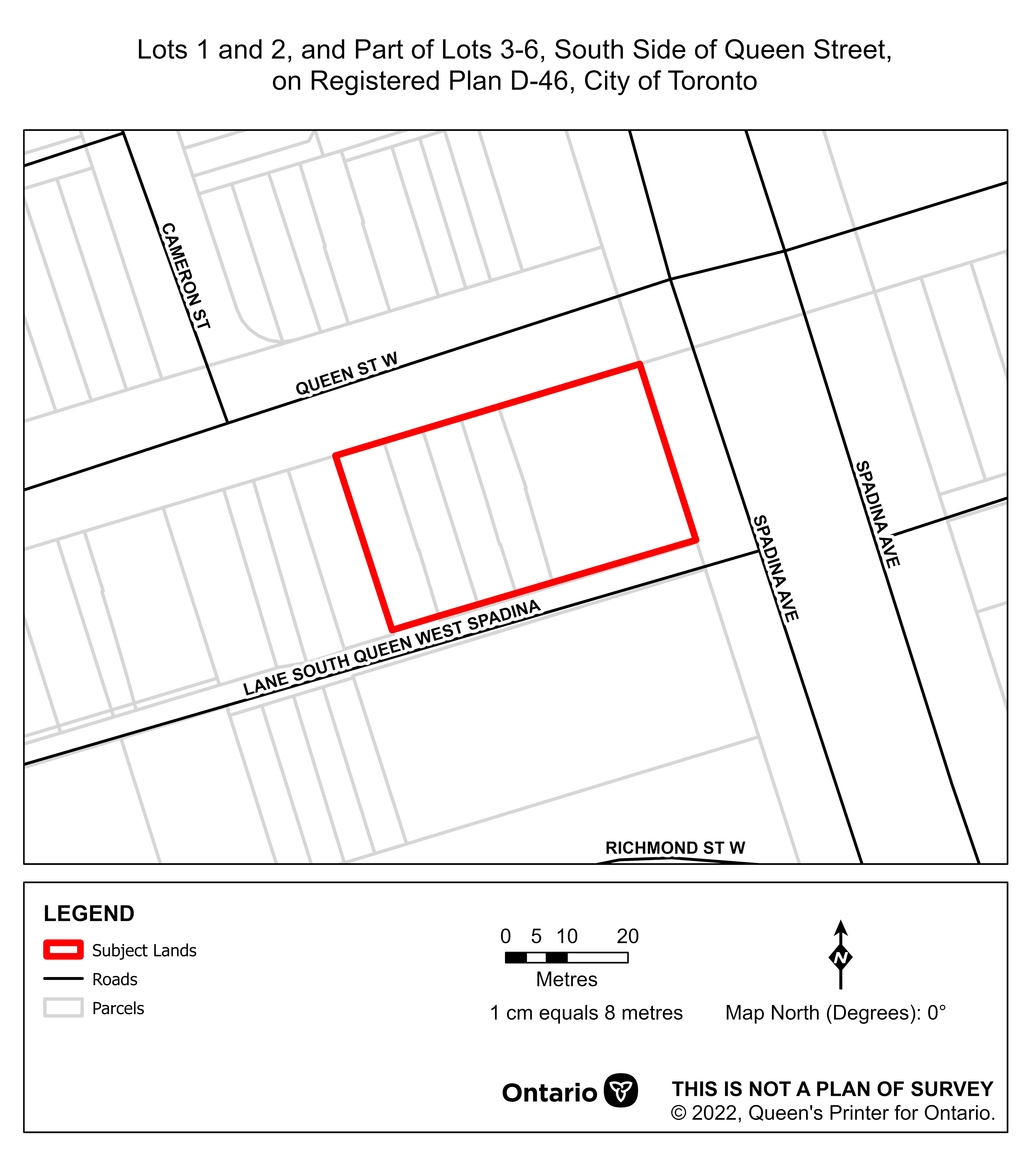 O. Reg. 334/22 applies to the lands known municipally as 443-455 Queen Street West, located on the south-west corner of Queen Street West and Spadina Avenue, in Toronto.