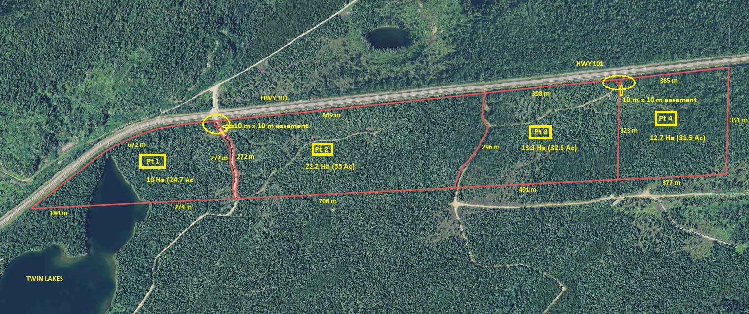 The retained lot would be 10 hectares with 672 metres of frontage on Highway 101. No new buildings or structures are proposed as a result of this application.
