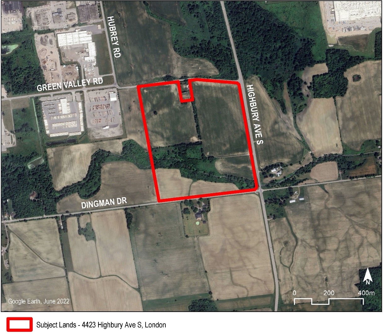 The subject lands are situated approximately 1.6 kilometres south of Highway 401 West and consist of a single vacant parcel with an approximate lot area of 37.72 hectares, and with frontage along Highbury Avenue South, Dingman Drive, and Green Valley Road. See link to location map below.
